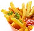 Fried cassava with fried pieces of pork served with tomato sauce.