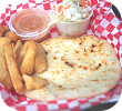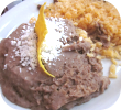 Two 4-oz ground beef cakes mixed with vegetables, served with rice, refried beans, fresh homemade cheese, tomato sauce and homemade salad.