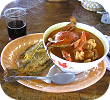 Traditional chicken hen soup with fresh cilantro, chipilin, loroco, served with grilled hen on the side.
